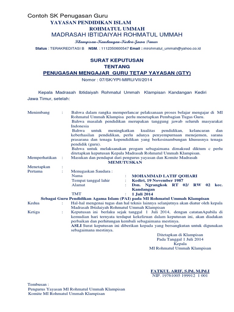 Maka dengan ini yayasan pondok pesantren sabilul huda kota malang. Guru honorer atau guru sukarela yang diangkat oleh ketua yayasan harus diberi surat keputusan (sk). 659 pm posted by indana labels. Contoh format sk pengangkatan kepala sekolah swasta dari ketua yayasan. Contoh format sk pengangkatan guru tetap atau tenaga honor yayasan tk kb hari ibu kartu pernikahan guru from id.pinterest.com. Yayasan pendidikan pesantren zahrotul islam. Contoh surat keputusan uraian tugas. Download contoh sk guru tetap yayasan format 638 x 1051 pixel. Contoh sk pengangkatan ketua yayasan guru ilmu sosial. Contohnya untuk kepemilikan nuptk, pengajuan atau daftar sertifikasi guru, dan lain. Contoh selengkapnya bisa bapak/ibu dapatkan dalam bentuk dokumen word melalui tautan berikut: Klik untuk memperluas informasi dokumen. Download contoh sk guru tetap yayasan untuk madrasah format microsoft office word.
